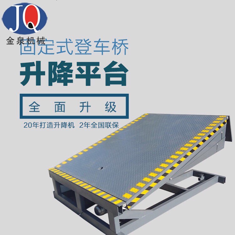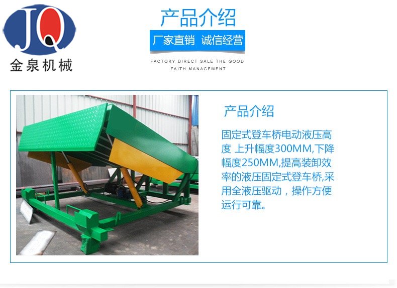 固定液壓登車橋是用于叉車與貨車之間的搭橋設備,方便裝卸貨物。液壓登車橋在現代物流現場已是一非常易見的結構 形式。它是企業物流鏈的起點與終點,是企業快速、安全周轉產品及貨物的一個裝卸貨操作平臺。 裝卸貨操作平臺的高度固定,但來往運輸車廂的廂地高度不一,運輸車輛與裝卸貨站臺之間總是形成一定的高度落差或間隙。造成搬運叉車不能進出運輸車輛直接裝卸貨物。運用登車橋提供可靠的連接。使搬運叉車能夠安全、快速地進出運輸車輛進行裝卸貨作業。